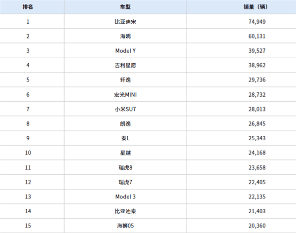 在销量排名中,比亚迪宋以74949辆的销量位居榜首,紧随其后的是海鸥车型,销量为60131辆。特斯拉的Model Y则以39527辆的销量位列第三。吉利星愿、轩逸、宏光MINI、小米SU7、朗逸、秦L和星越等车型也进入了销量前十名,分别实现了不俗的销售业绩。